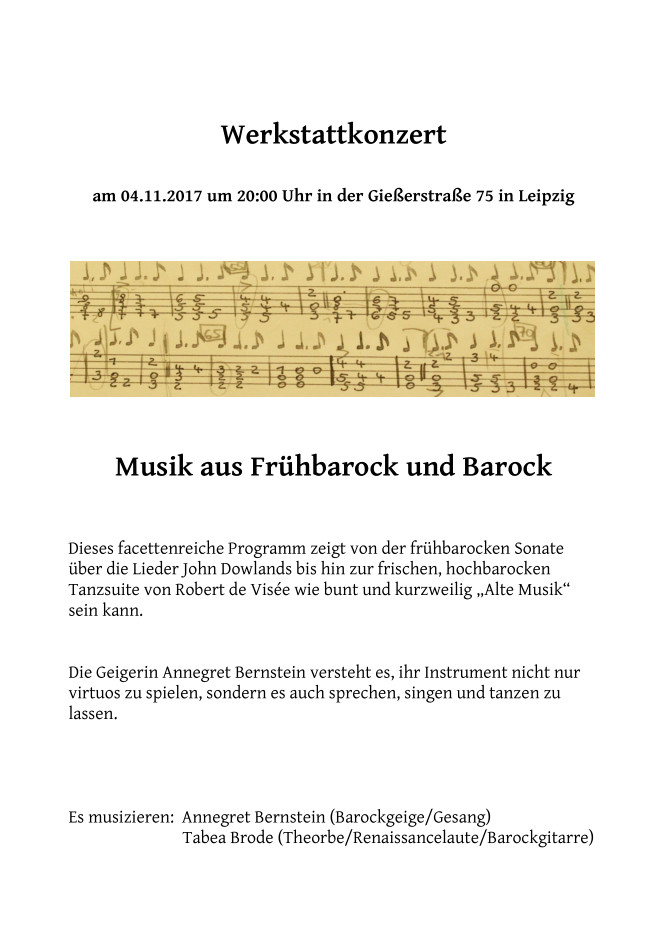 Europäisches Festival der Laute Füssen 15.-18. Juni 2017 Wittenberger Renaissance Musikfestival 28.-29. Oktober 2017 Tage alter Musik Herne - 10.-12. November 2017 4. Werkstattkonzert am 13. Januar 2017 mit Musik aus Italien, Spanien und Frankreich sowie Südamerika (Lambert, Monteverdi, Sanz….) ![]()